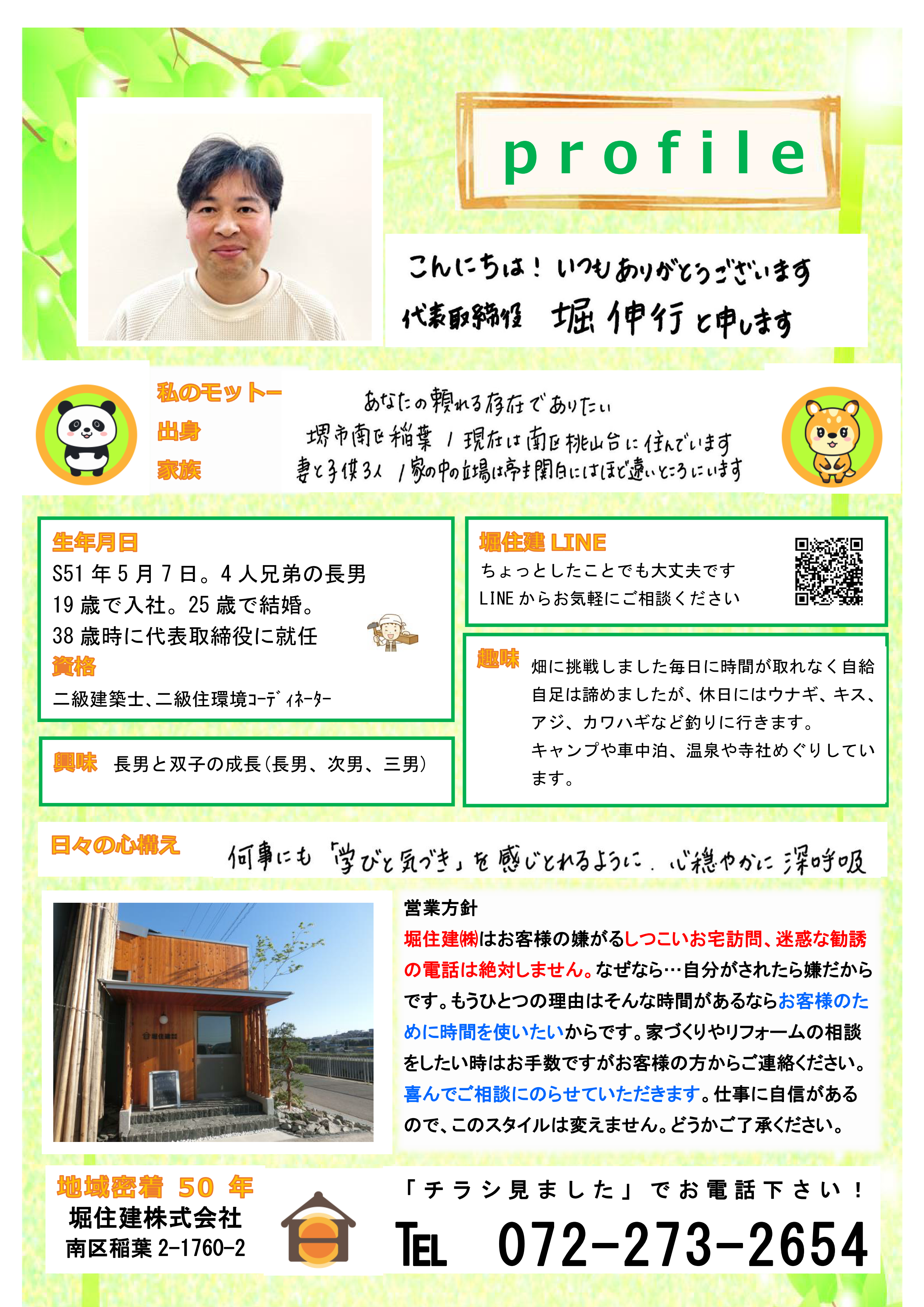 代表の堀伸行は、二級建築士・二級住環境コーディネーターの資格を持つ専門家です。「何かあった時だけでなく、普段から顔を知ってもらうことが大切」という思いのもと、気軽に相談できる環境づくりを大切にしています。しつこい訪問販売や迷惑な勧誘電話は一切行わず、お客様のペースに合わせた誠実な対応を徹底しています。